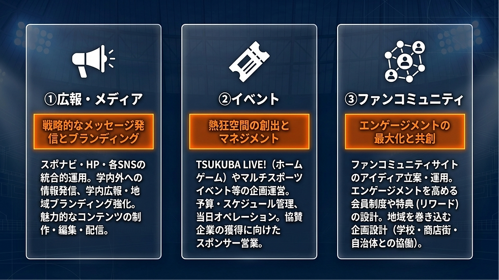 筑波スポーツを応援してくれる人を増やし、継続的に応援したくなるファンコミュニティを設計するチームです。